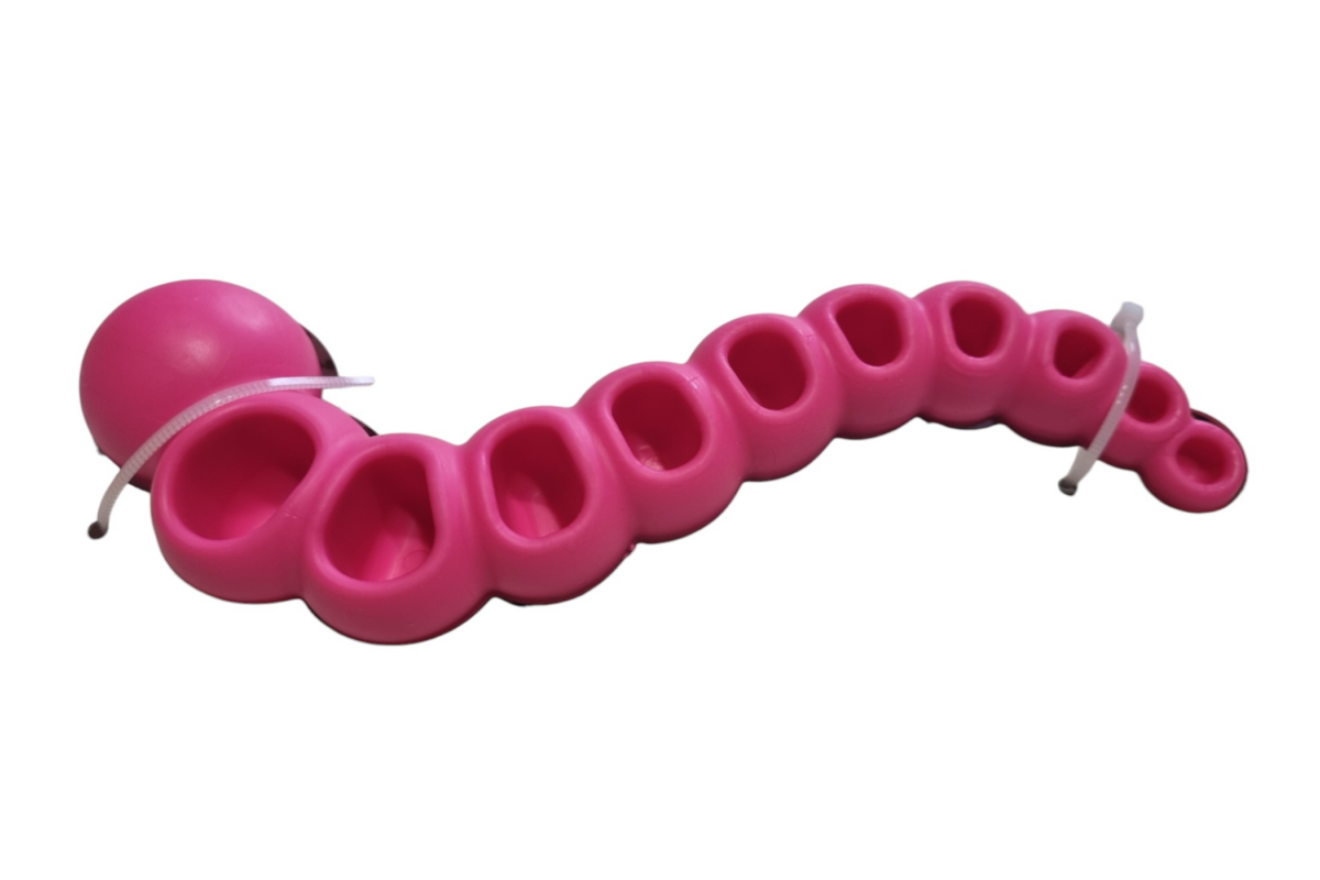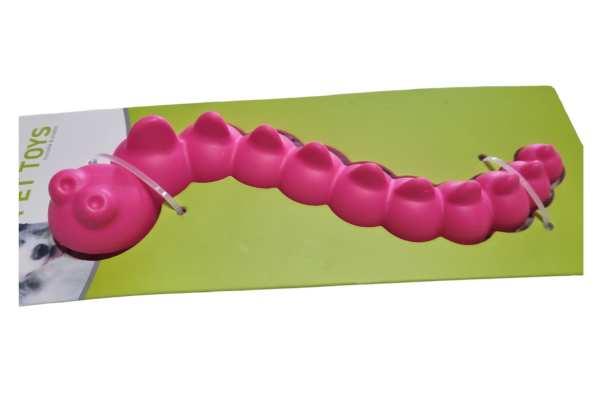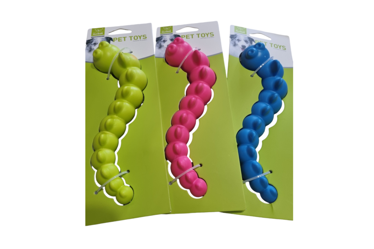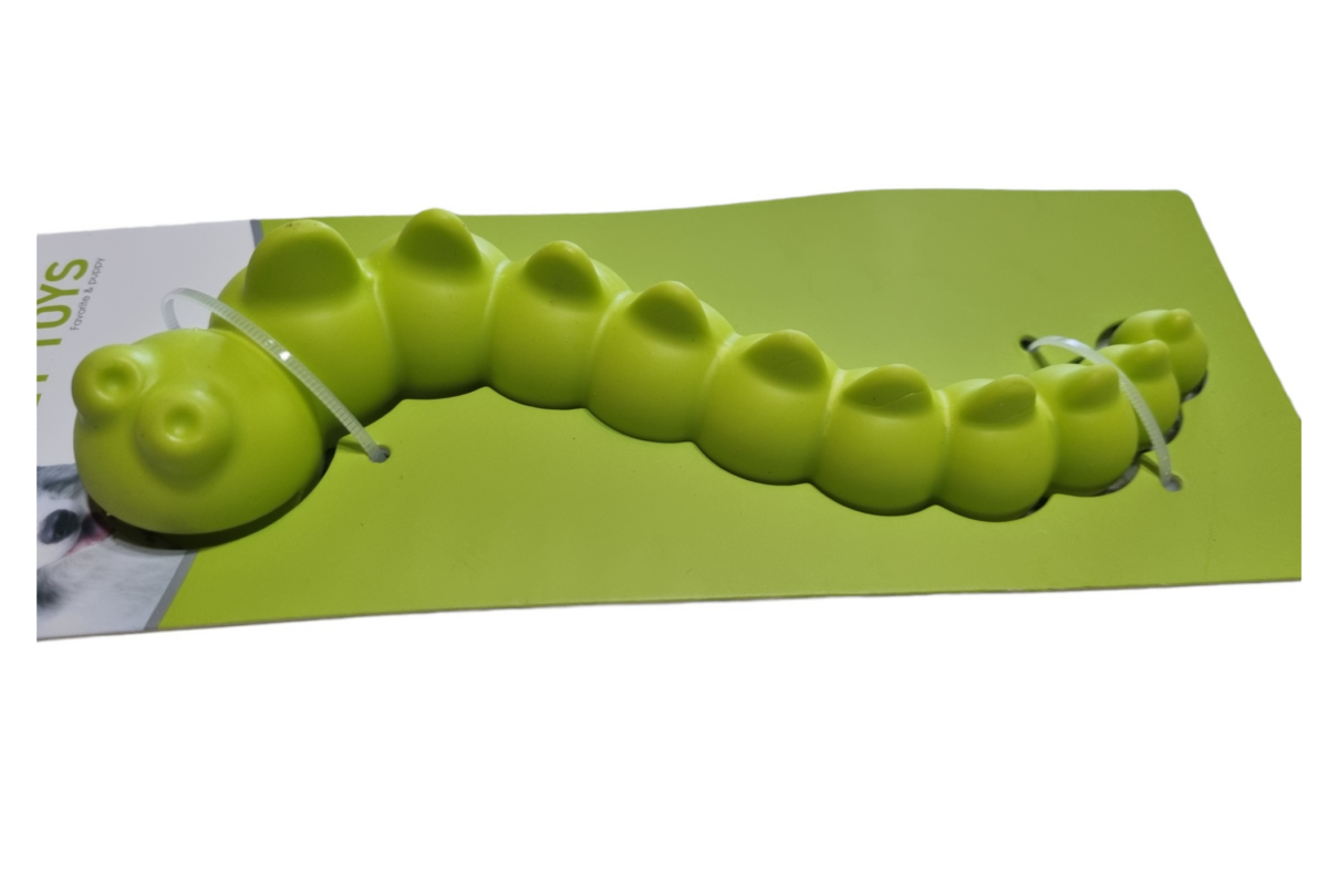 A Tömör gumihernyó egy vicces formájú rágójáték, ami amellett, hogy színes és cuki, igazán tartós is. TPR anyagból készült, ami egy nagyon erős gumi. Egyszerre szívós, kopás és harapásálló. A hernyó alján található lyukak miatt rágcsálás közben kíméletesen stimulálja a kutya ínyét és tisztítja a fogait.